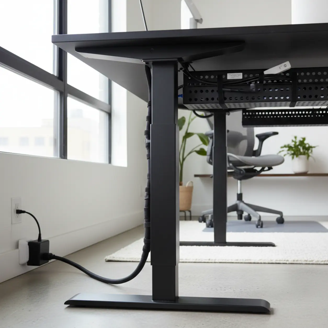 Dit is de meest kritieke zone voor sta-bureaus. De kabels moeten kunnen meebewegen met de hoogteverstelling zonder dat ze strak komen te staan of in een lus op de grond hangen als het bureau laag staat.