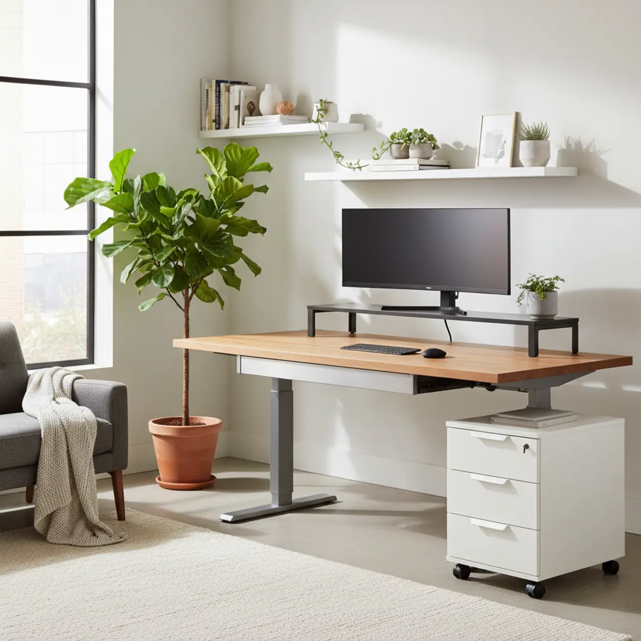 De overstap naar een ergonomische werkplek betekent niet dat je moet leven in een minimalistische woestijn zonder opbergruimte. Door slim gebruik te maken van de ruimte onder het blad met ondiepe lades, en de ruimte naast het bureau met verrijdbare kasten, combineer je het beste van twee werelden.