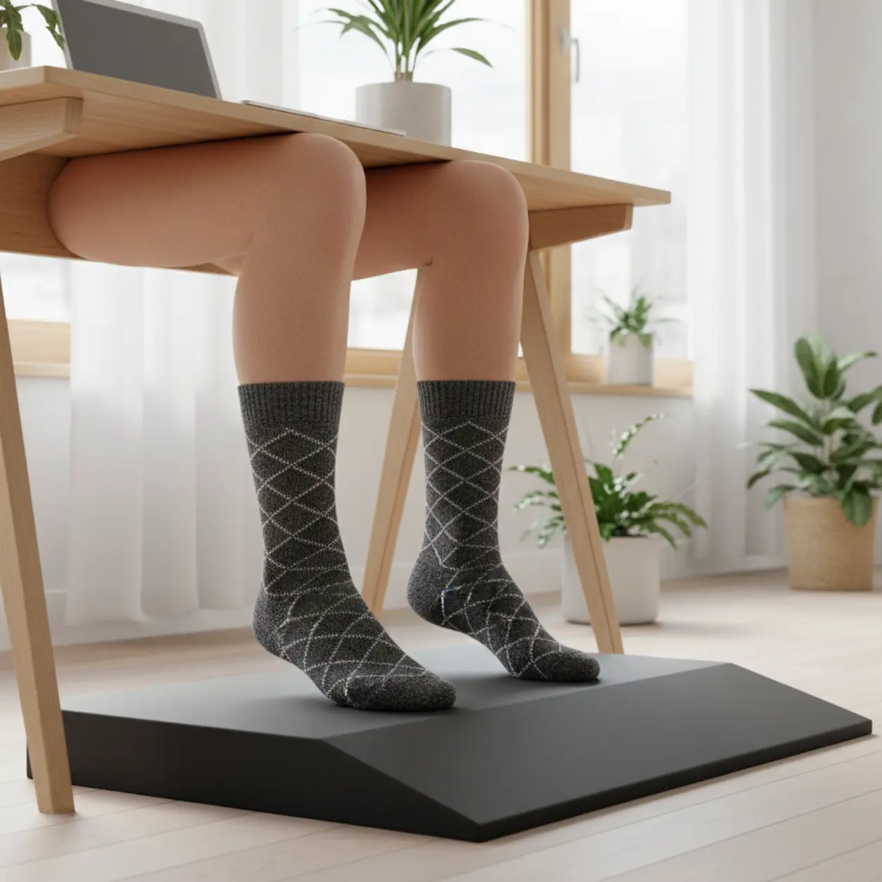 Door een mat met een helling te gebruiken, word je onbewust gedwongen om je houding regelmatig aan te passen. Je zet één voet op de helling, waardoor je kuitspier wordt gestrekt en je hamstrings worden ontlast. Even later wissel je van voet. Deze constante, subtiele beweging activeert de spierpomp in je kuiten. Dit mechanisme is essentieel voor het terugpompen van bloed vanuit je benen naar je hart.