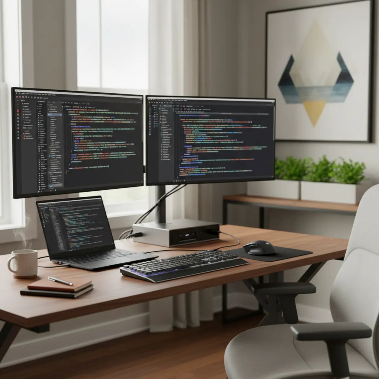 Wanneer je werkt met een uitgebreide IDE zoals Visual Studio, heb je schermruimte nodig. Je hebt je code, je terminal, je live preview en waarschijnlijk een venster met documentatie open staan. Werken op een enkel laptopscherm leidt gegarandeerd tot nekklachten en een verminderde productiviteit door het constante wisselen tussen vensters.